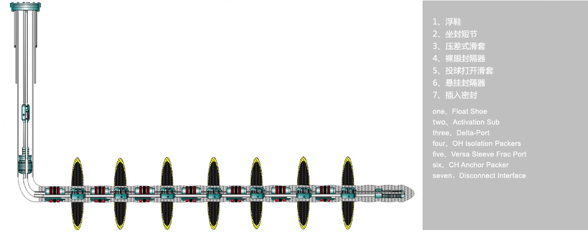 完井技术服务: 完井所用的井下工具及零部件 水平井多级分段压裂工具 井下安全阀及地面驱动器 封隔器系列 完井附件 钢丝作业工具 地面防喷设备 井口控制系统 产品获得美国石油学会颁发的API证书 裸眼水平井多级压裂系统: